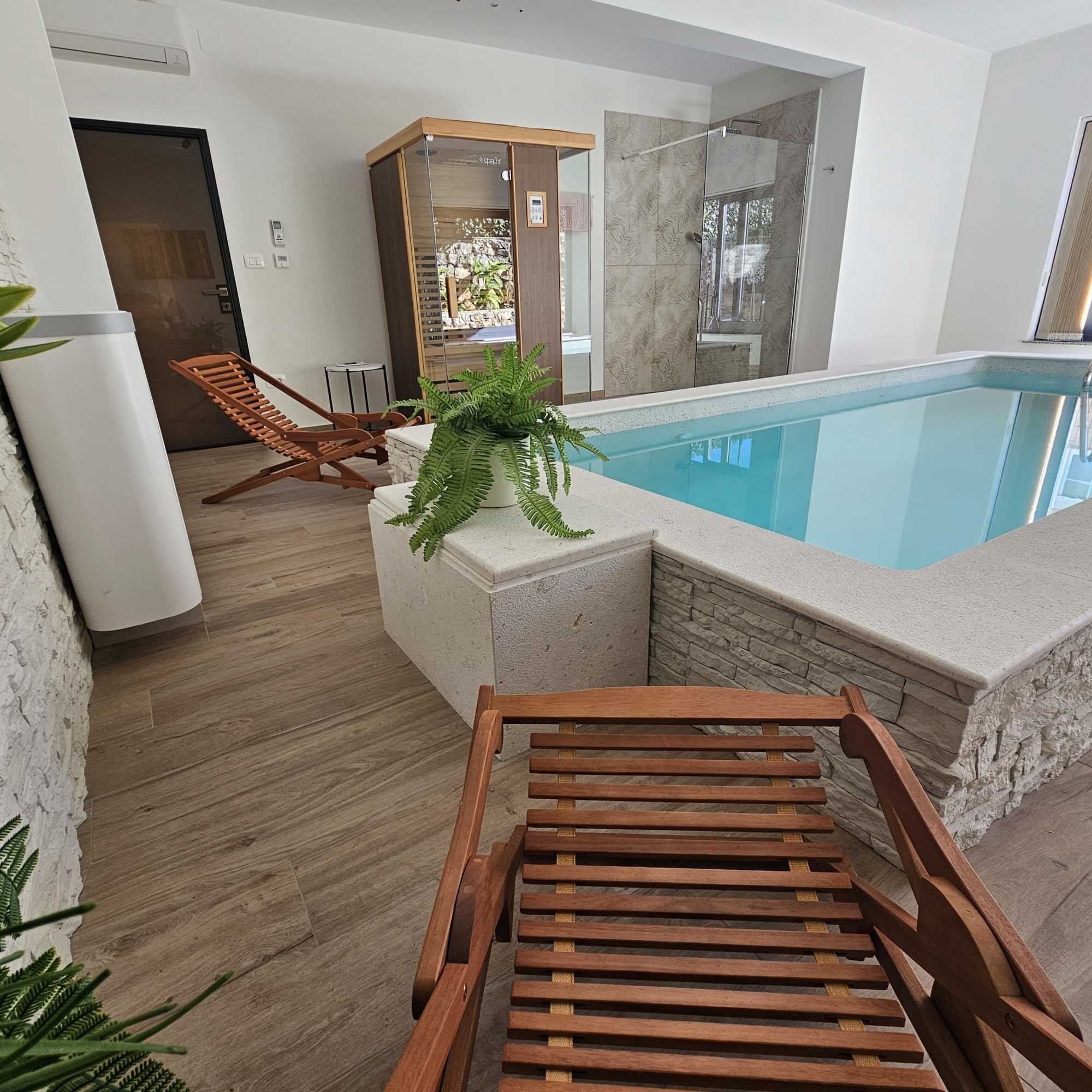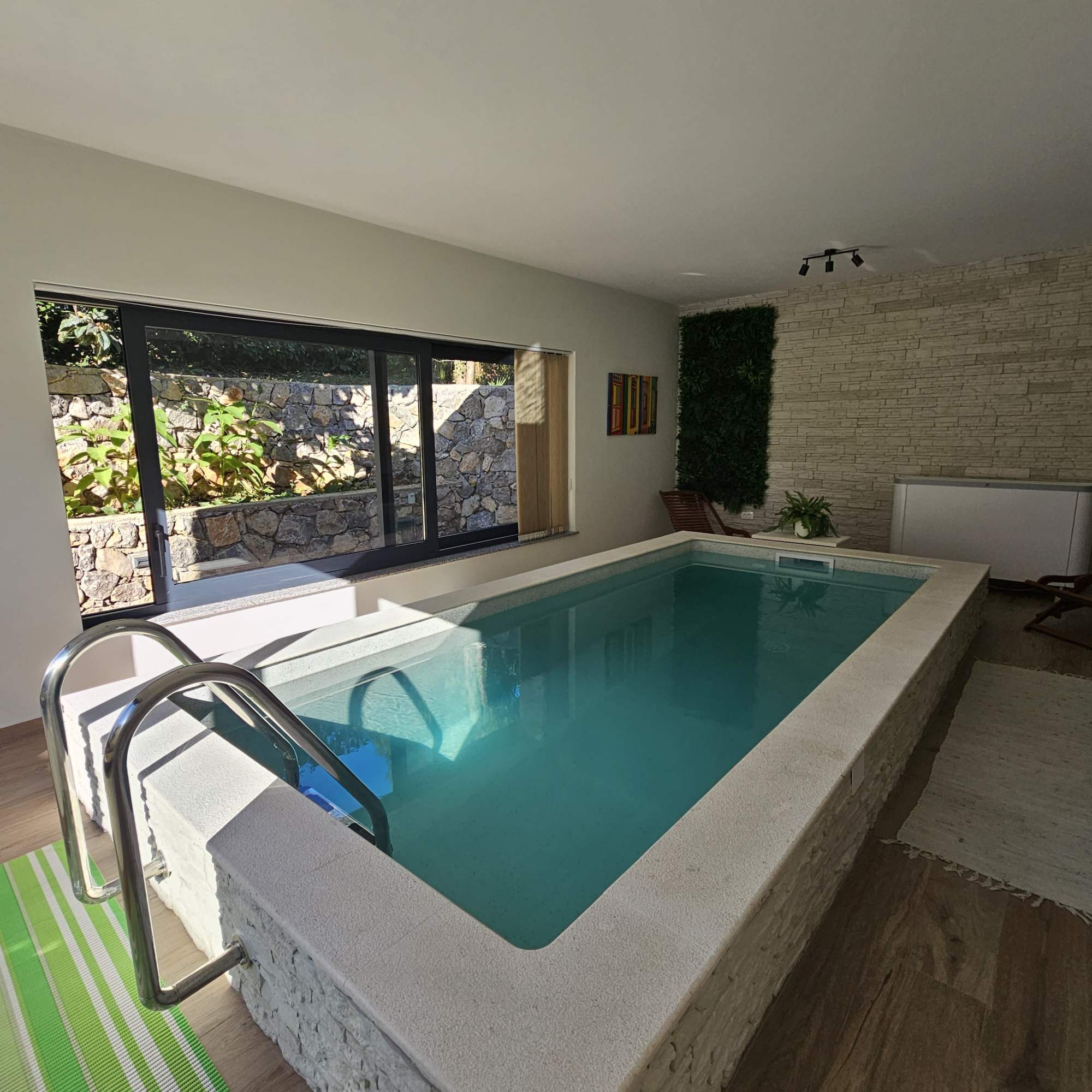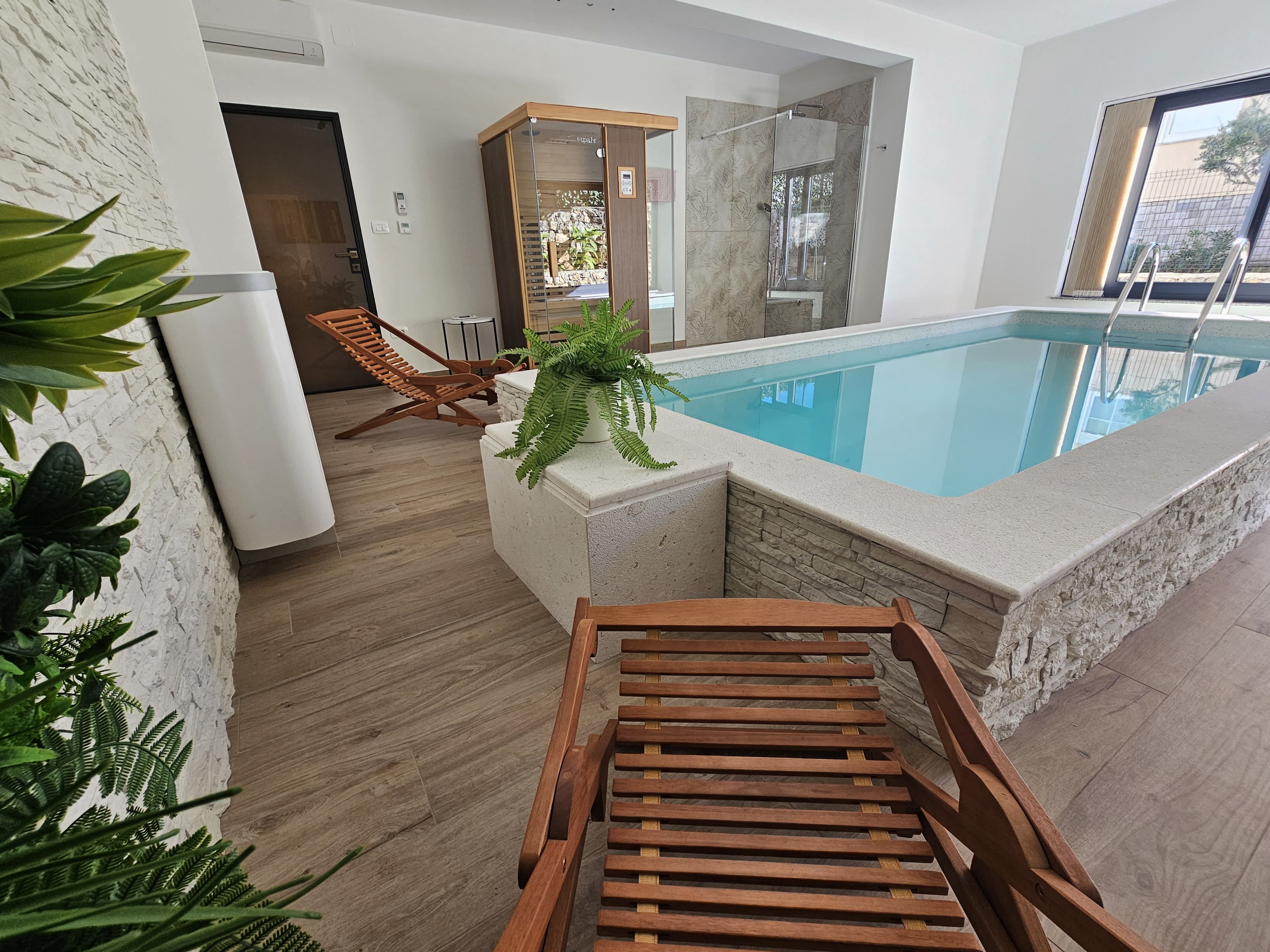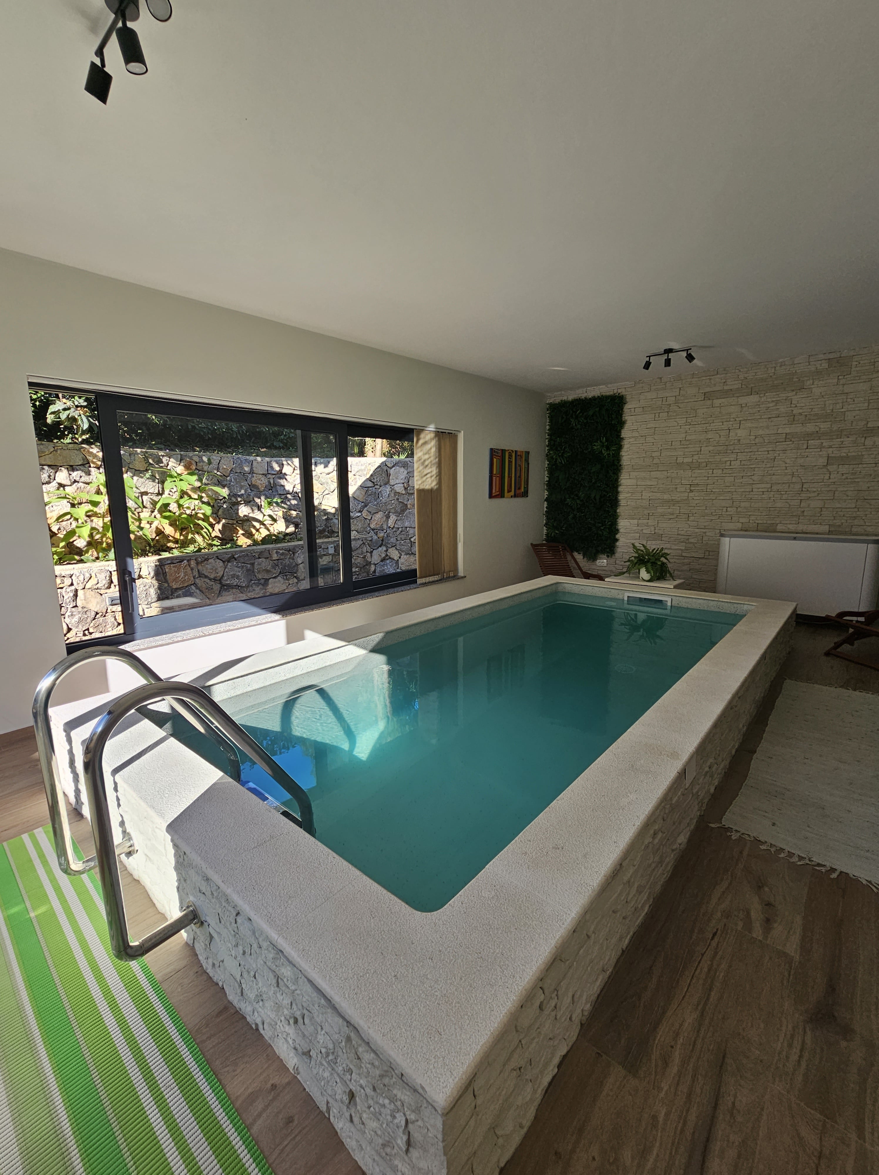 Unwind in the indoor or outdoor pool, enjoy the private sauna, or simply relax on the terrace with a barbecue. The indoor pool is heated from October 1st, making it an ideal spot for relaxation during cooler months. The house is equipped with underfloor heating, fast Wi-Fi, and private parking for multiple cars, ensuring maximum comfort for the guests.
